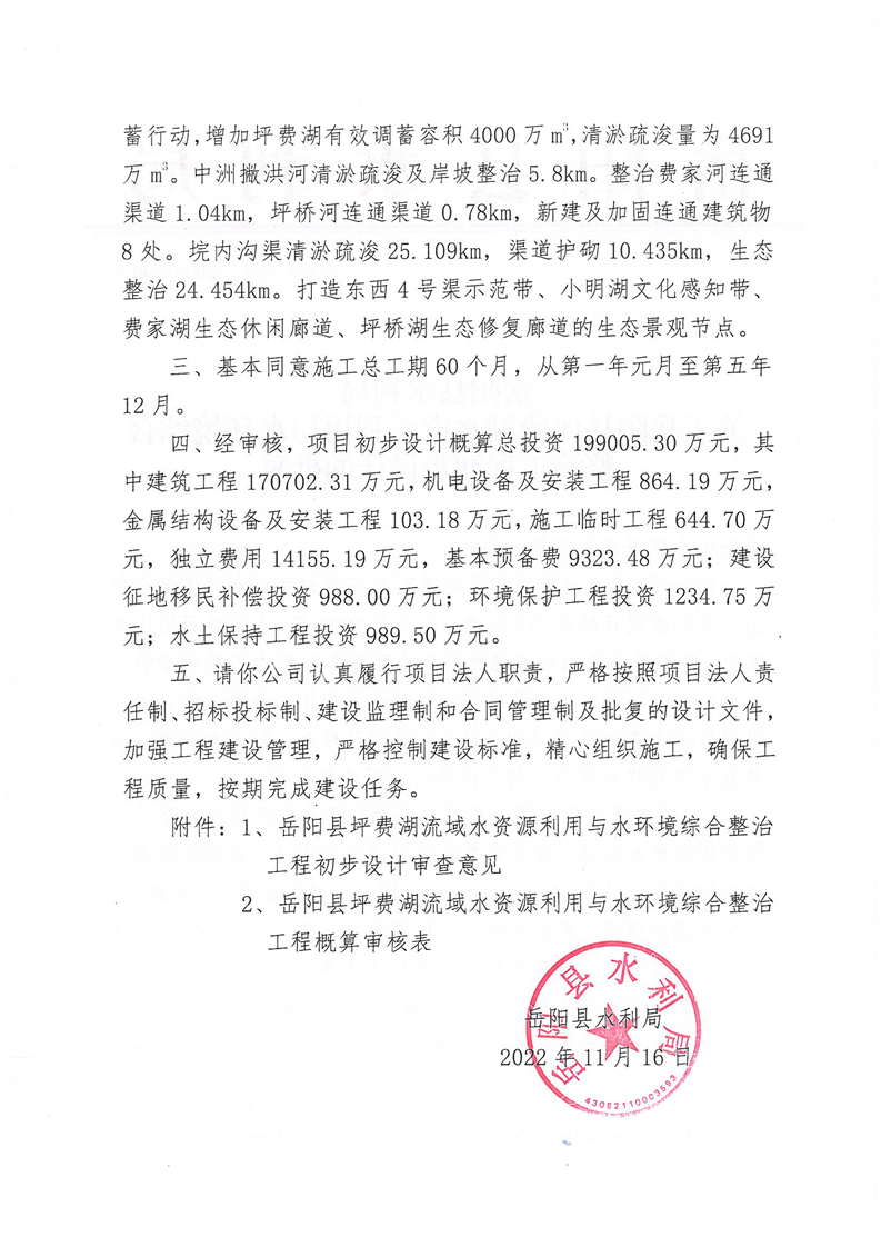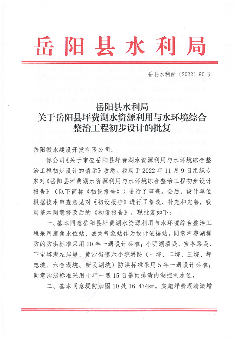 嶽陽縣水利局關於嶽陽縣坪費湖水資源利用與水環境綜合整治工程初步設計的批複