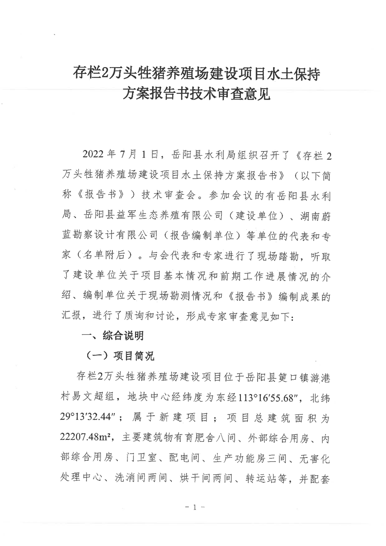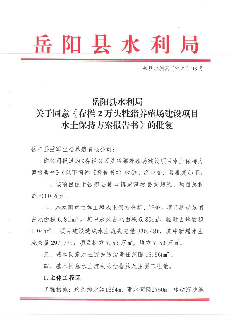 嶽陽縣水利局關於同意《存欄2萬頭牲豬養殖場建設項目水土保持方案報告書》的批複