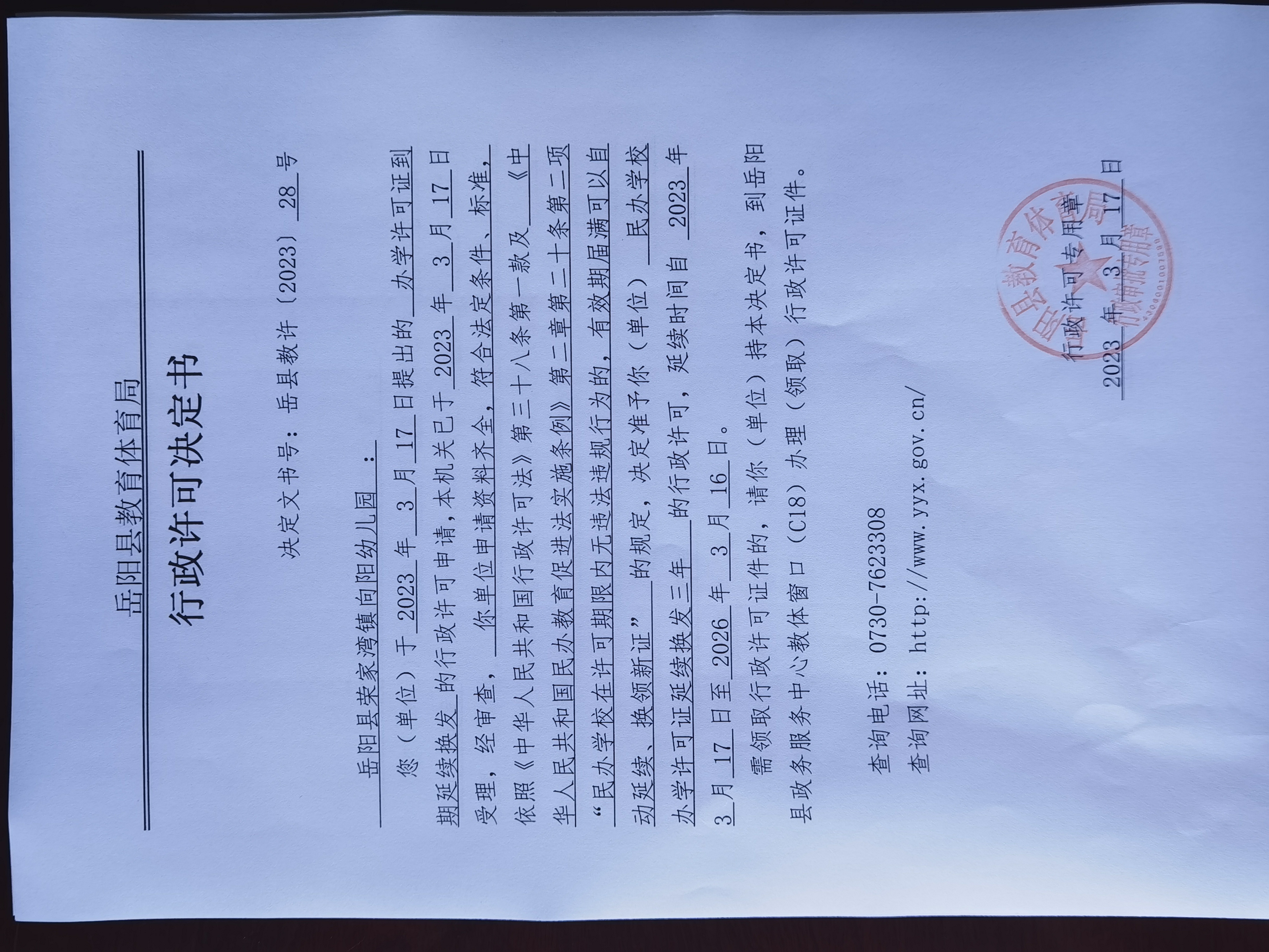 關於準予嶽陽縣榮家灣鎮向陽幼兒園辦學許可證到期延續換發的許可決定
