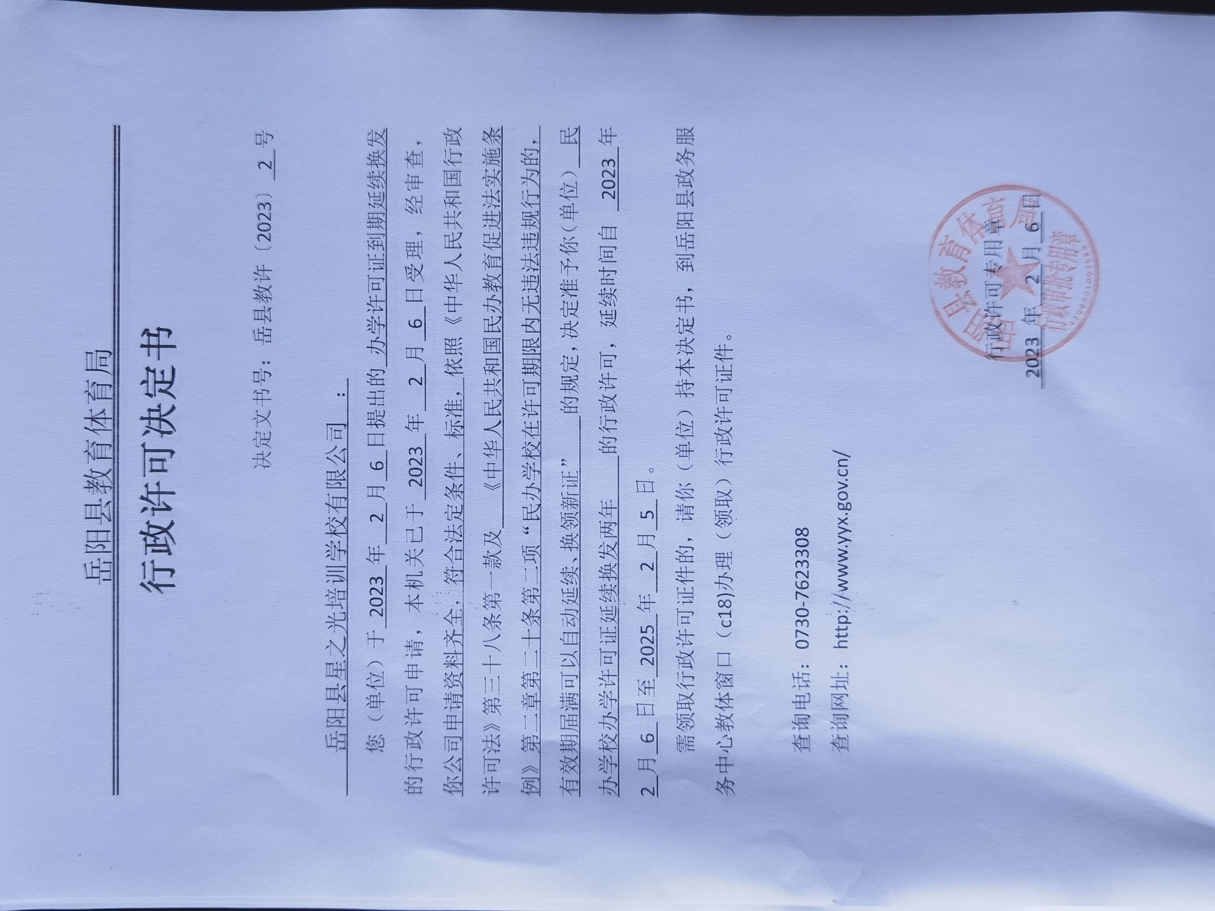 關於準予嶽陽縣星之光培訓學校有限公司辦學許可證到期延續換發的許可決定