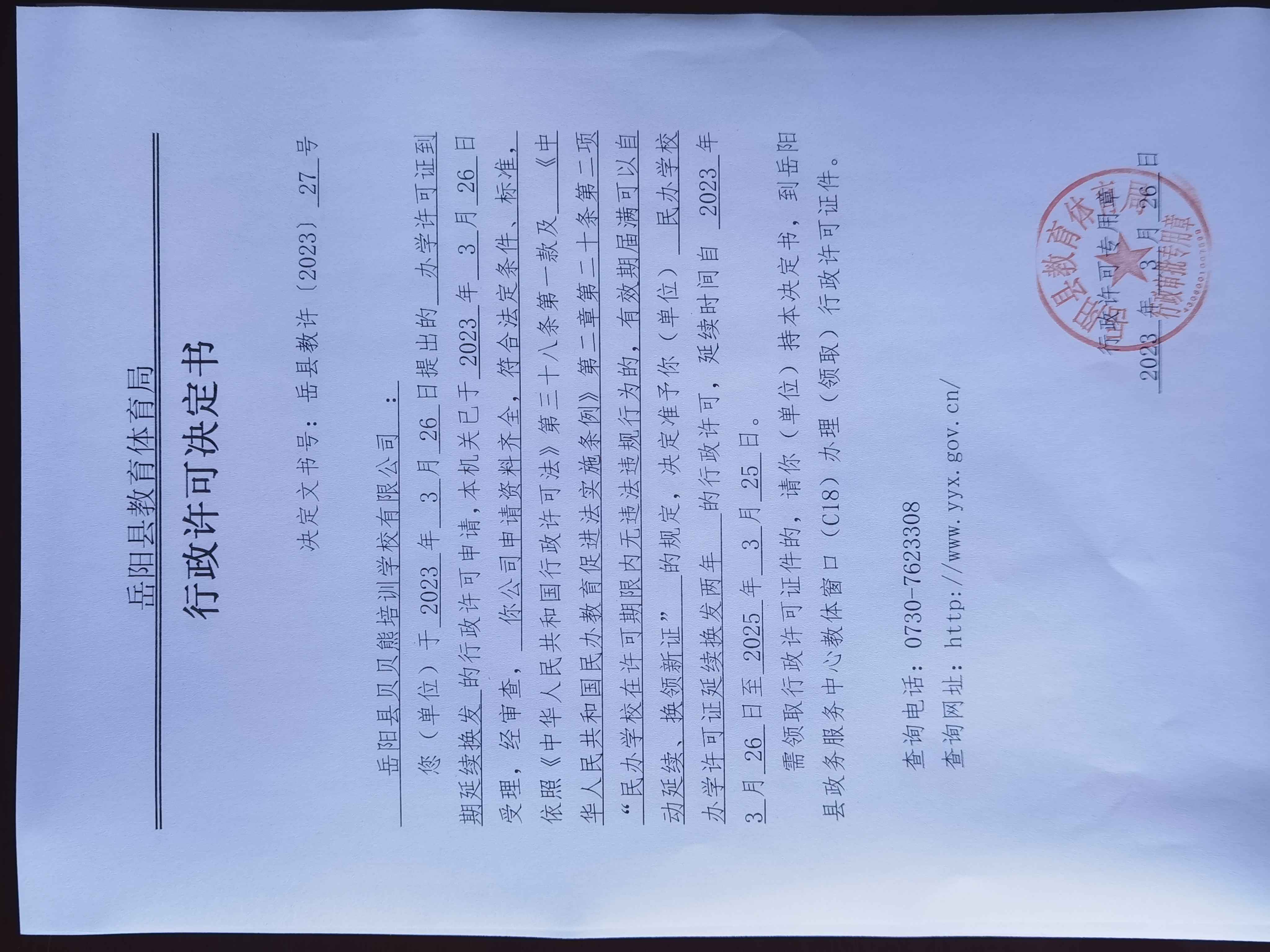 關於準予嶽陽縣貝貝熊培訓學校有限公司辦學許可證到期延續換發的許可決定