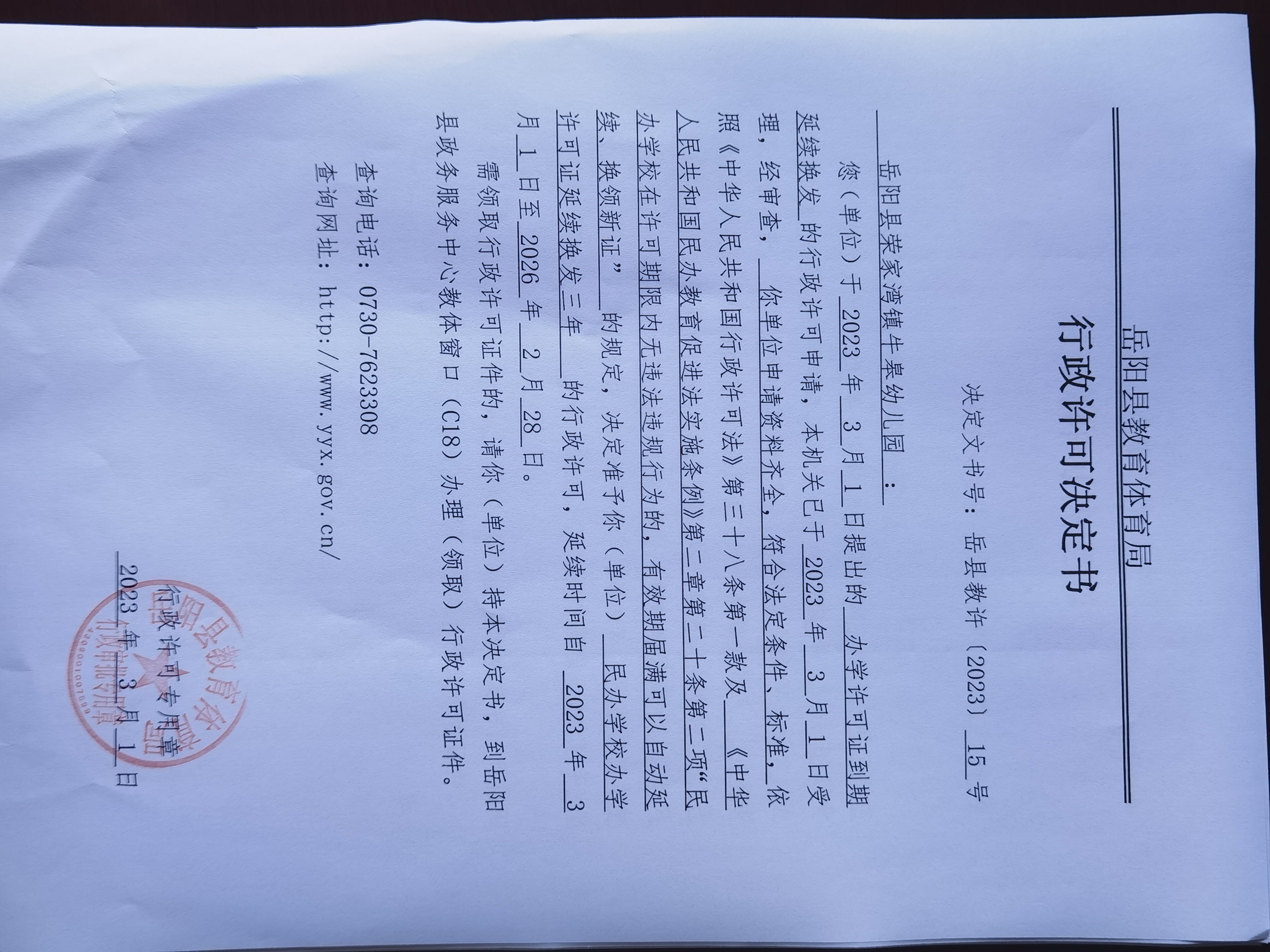 關於準予嶽陽縣榮家灣鎮牛皋幼兒園辦學許可證到期延續換發的許可決定