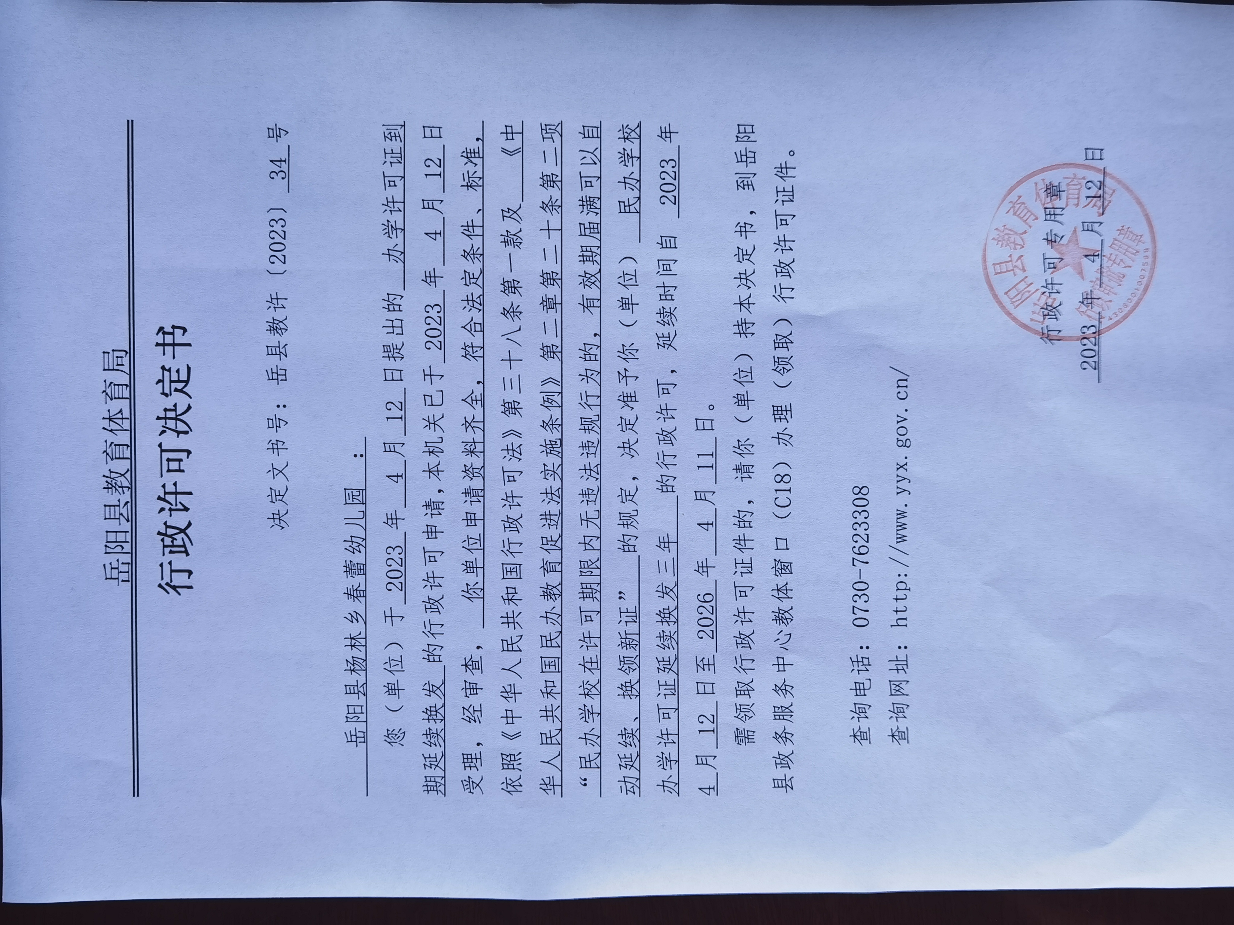 關於準予嶽陽縣楊林鄉春蕾幼兒園辦學許可證到期延續換發的許可決定