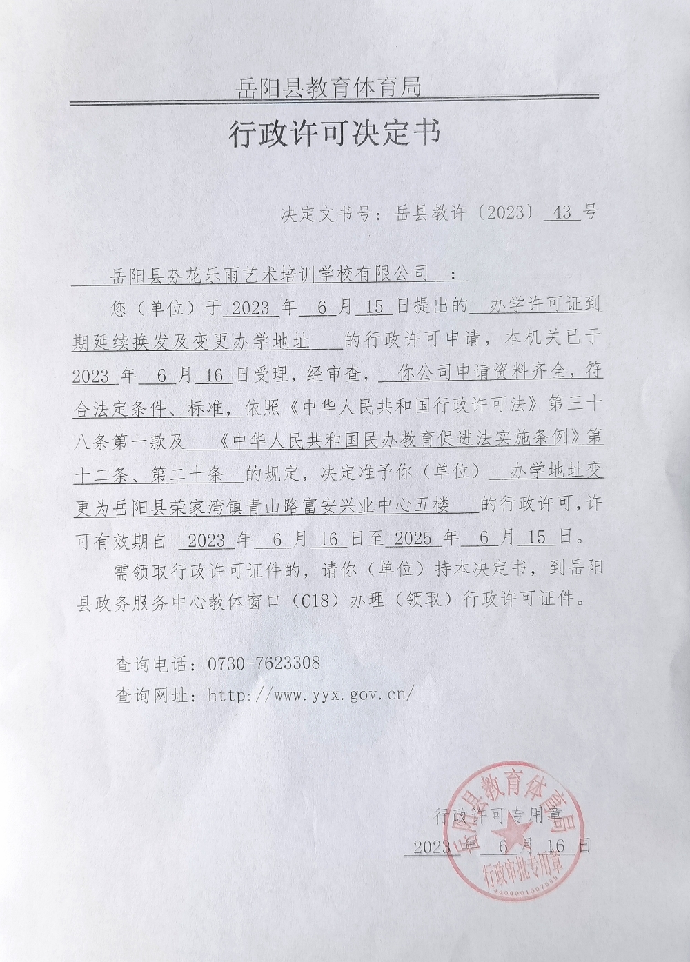 關於準予嶽陽縣芬花樂雨藝術培訓學校有限公司辦學許可證到期延續換發及變更辦學地址的許可決定