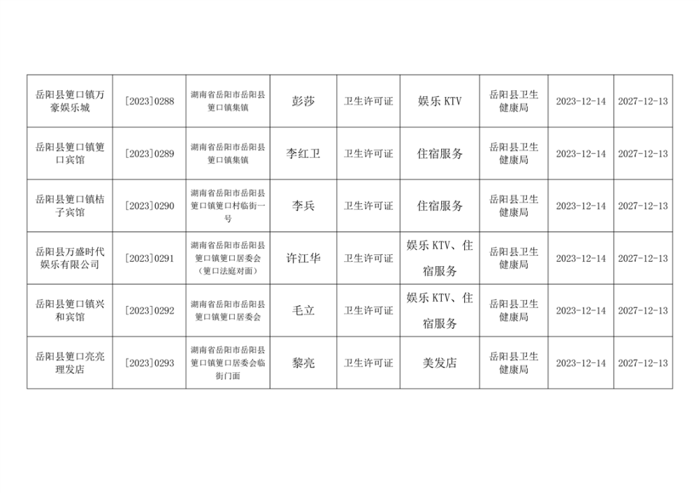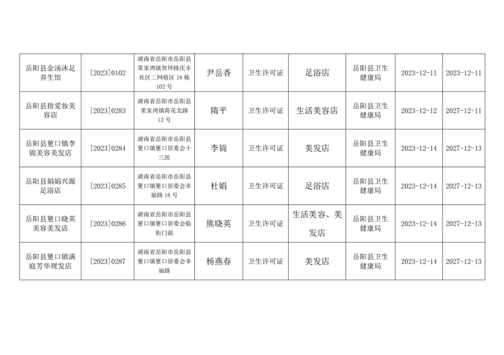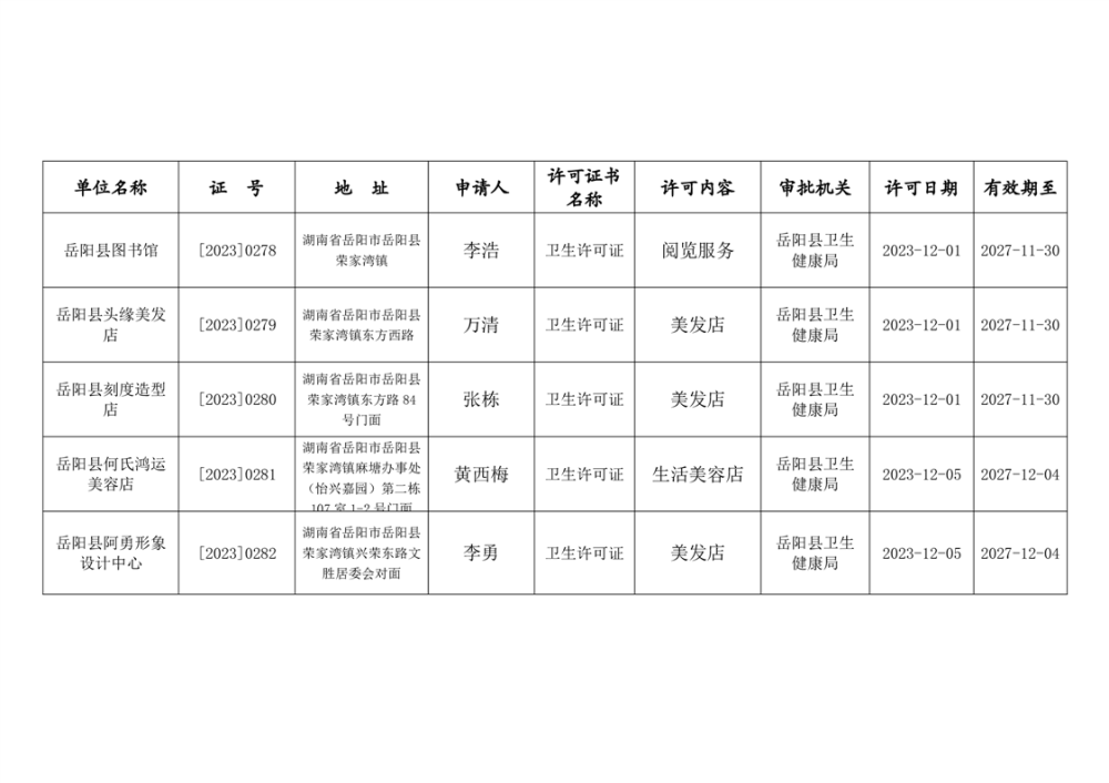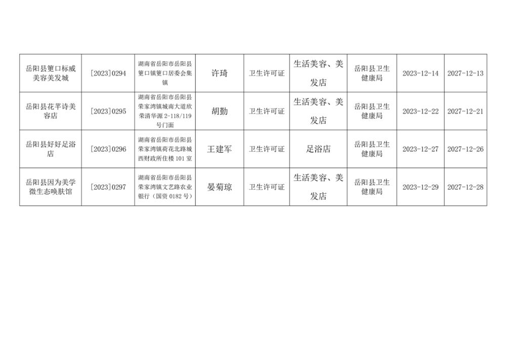 嶽陽縣衛生健康局2023年12月公共場所衛生許可項目公示