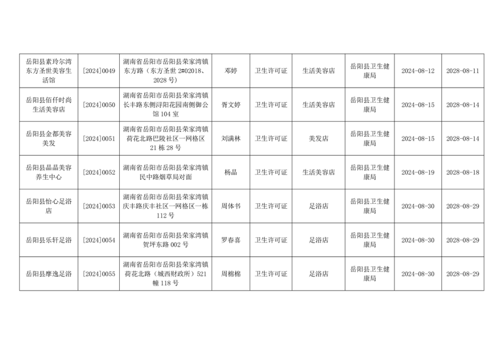 嶽陽縣衛生健康局2024年8月公共場所衛生許可公示