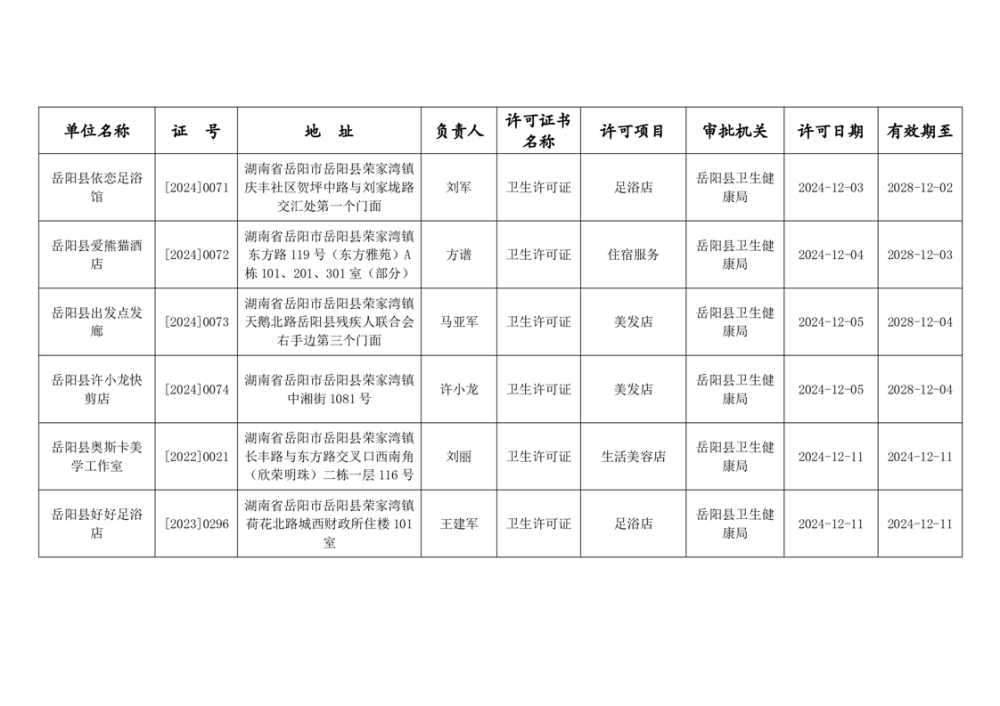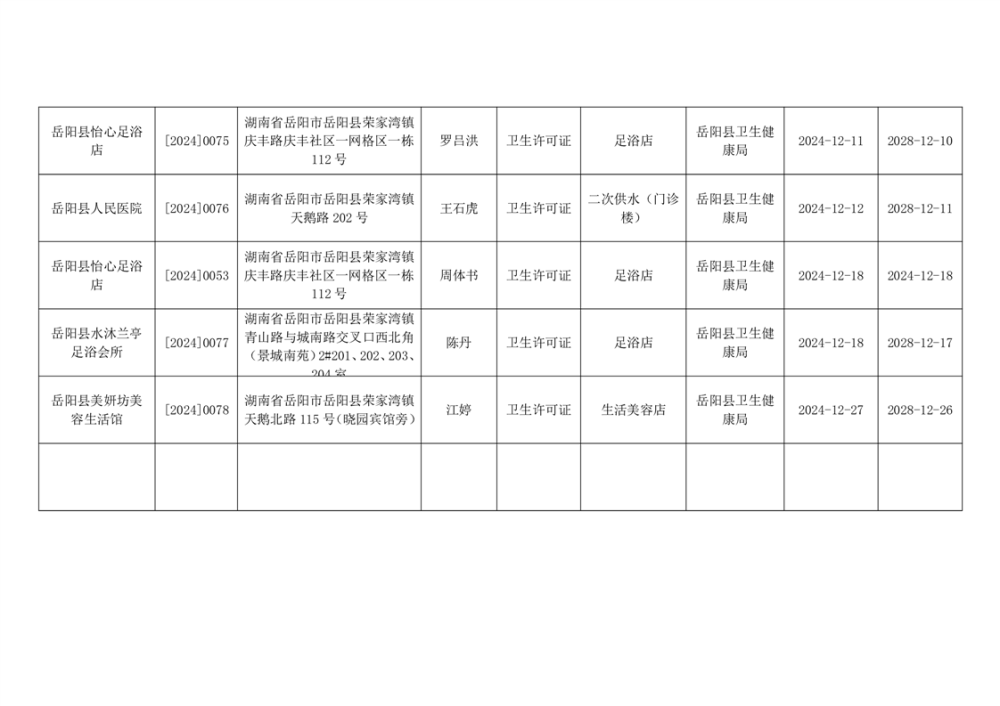 嶽陽縣衛生健康局2024年12月衛生許可公示