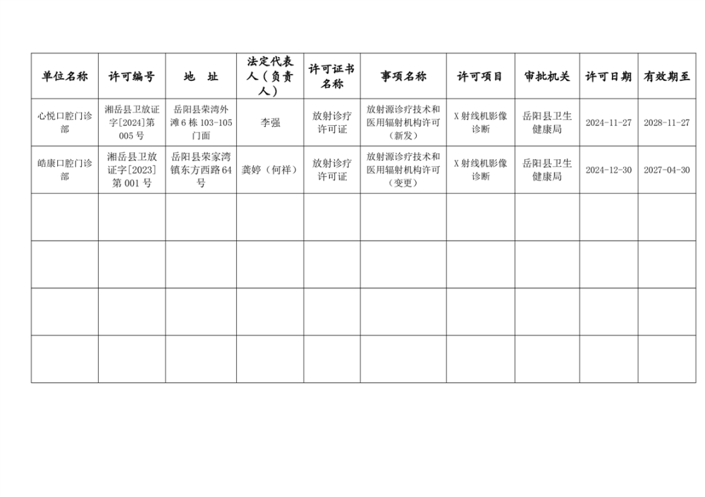 嶽陽縣衛生健康局2024年第二批放射診療許可公示