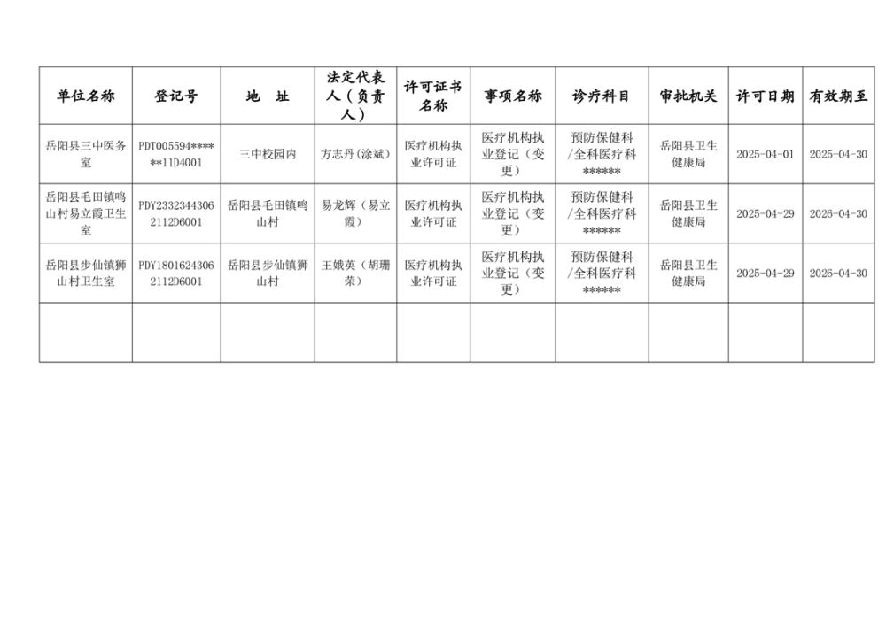 嶽陽縣衛生健康局2025年4月醫療機構執業許可公示