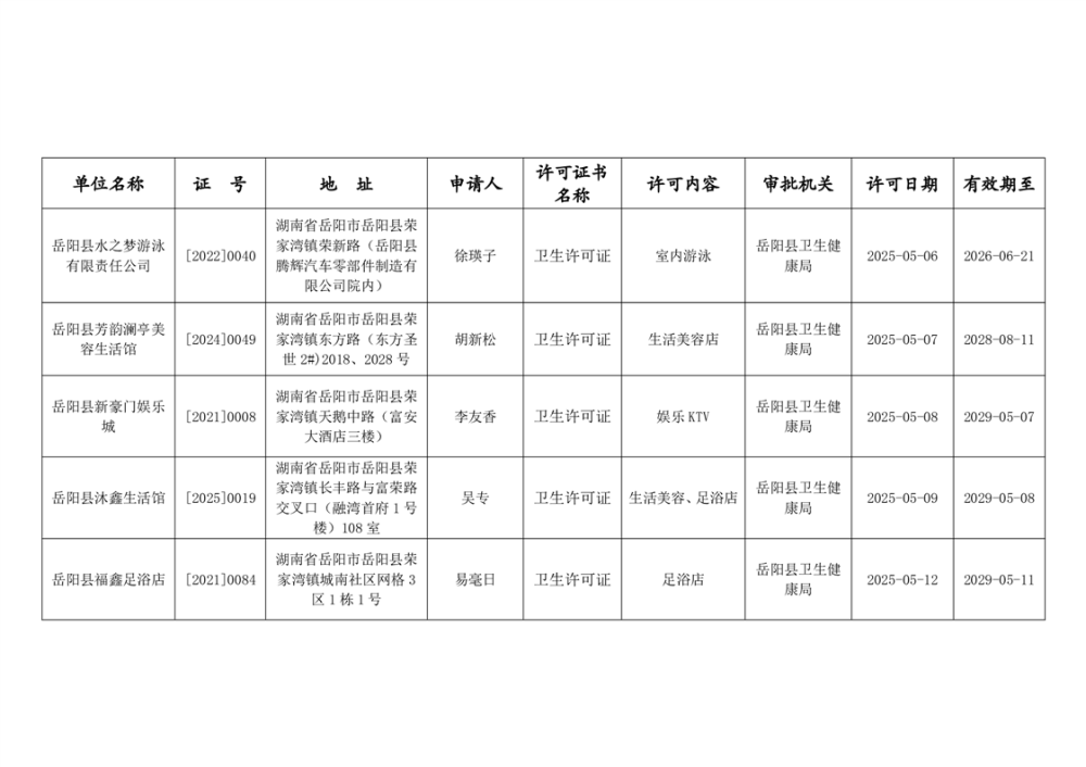 嶽陽縣衛生健康局2025年5月衛生許可公示