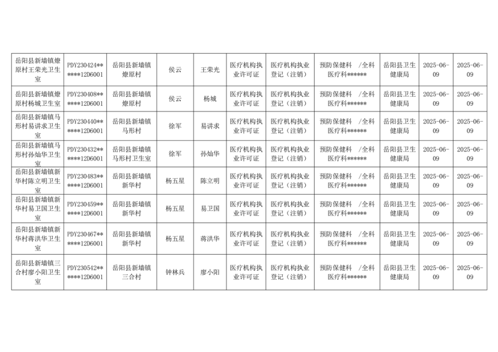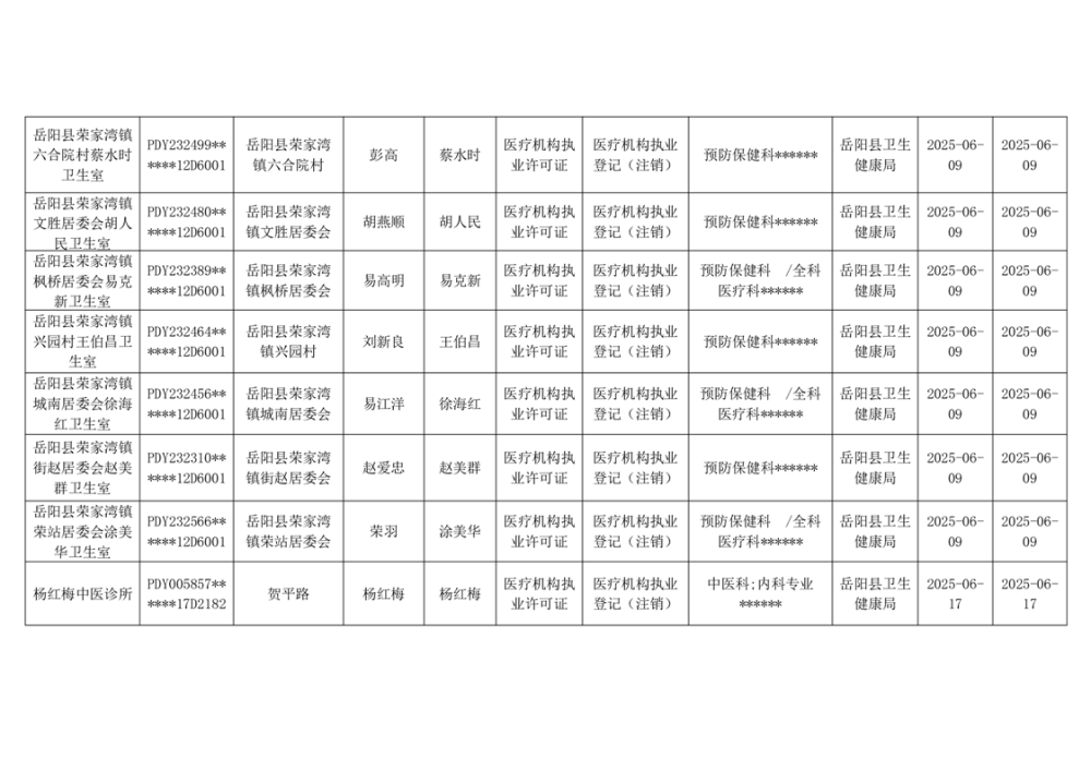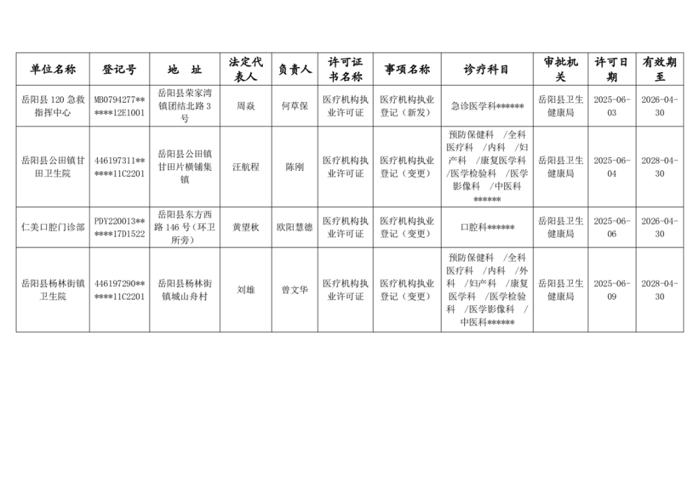 嶽陽縣衛生健康局2025年6月醫療機構執業許可公示
