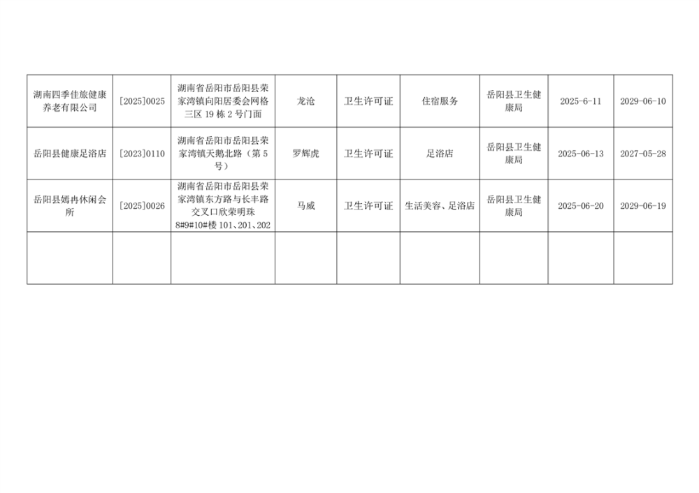 嶽陽縣衛生健康局2025年6月衛生許可公示
