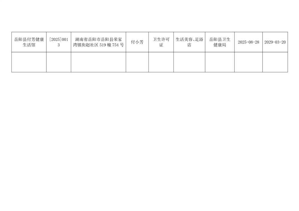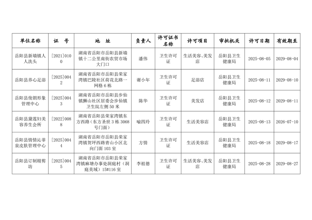 嶽陽縣衛生健康局2025年8月衛生許可公示