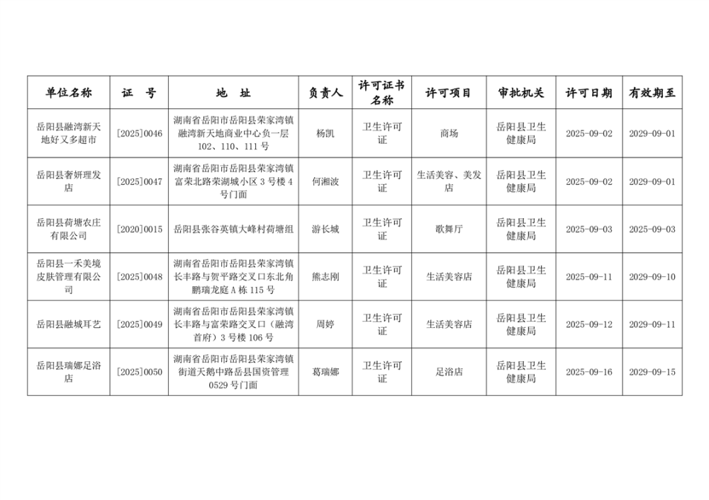 嶽陽縣衛生健康局2025年9月衛生許可公示