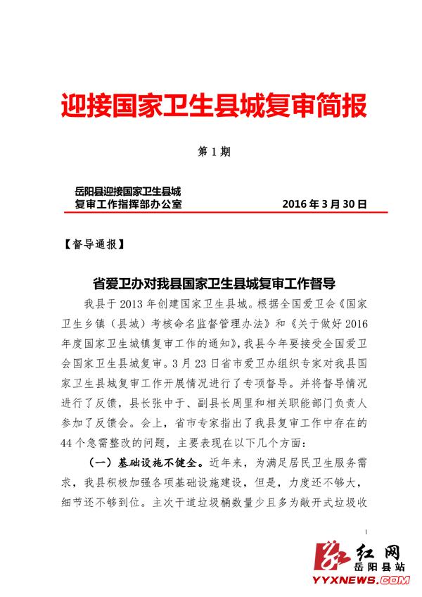迎接國家衛生縣城複審簡報(第1期)