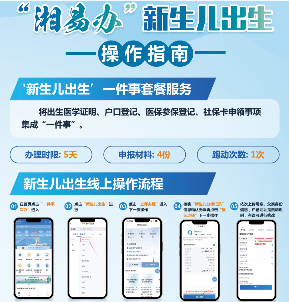 新手爸媽們,“湘易辦”“一件事一次辦”模塊中已上線“新生兒出生一件事”功能啦,隻要登錄“湘易辦”,線上提交新生兒父母雙方的身份證、戶口本、結婚證,便可“一站式”同步進行《出生醫學證明》申領、新生兒落戶登記、城鄉居民醫保參保登記等服務。