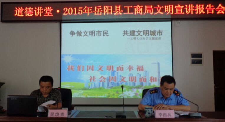 為廣泛深入宣傳公民道德、文明禮儀和文明城市創建知識,8-28下午,在縣工商局七樓會議室,組織開展了“道德講堂”進機關文明宣講會,縣工商局全體人員、城關一、二、三所、東洞庭湖所全體人員及各農村所所長、縣工商局機關院內住戶參加了此次宣講活動。