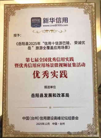 12月13日,在中國(台州)信用建設高峰論壇上傳來振奮人心的消息 :由嶽陽縣發改局報送的“信用+信遊巴陵、榮誠優嶽”旅遊全覆蓋應用場景,榮獲“全國信用應用場景優秀實踐”獎。這不僅是嶽陽縣信用建設成果的肯定,更是嶽陽市首個在社會信用體係建設領域獲得的國家級榮譽,實現了曆史性的突破!