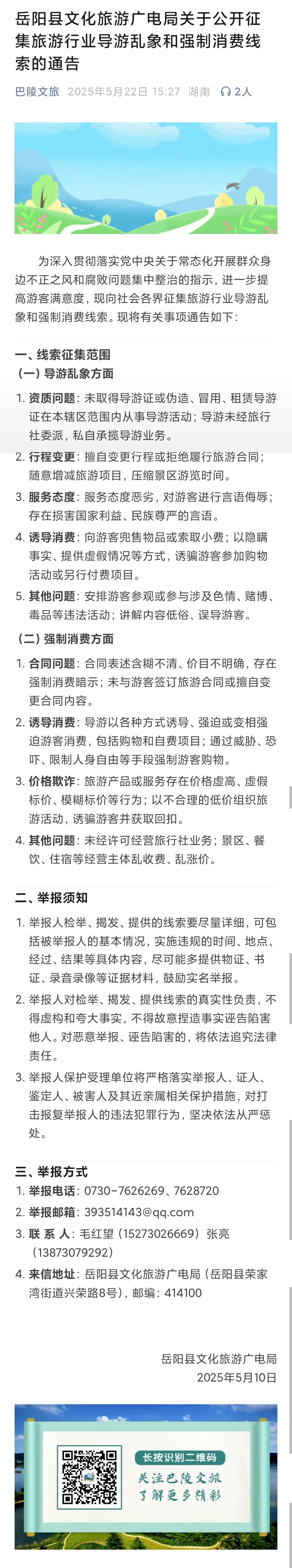 嶽陽縣文化旅遊廣電局關於公開征集旅遊行業導遊亂象和強製消費線索的通告