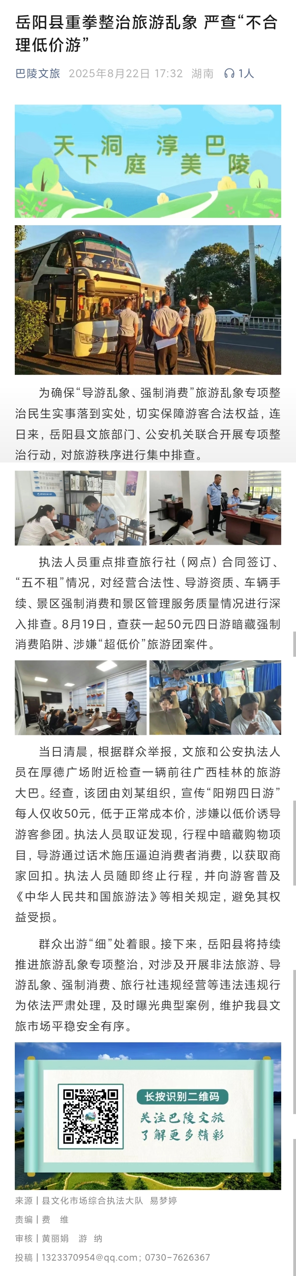 嶽陽縣重拳整治旅遊亂象 嚴查“不合理低價遊”