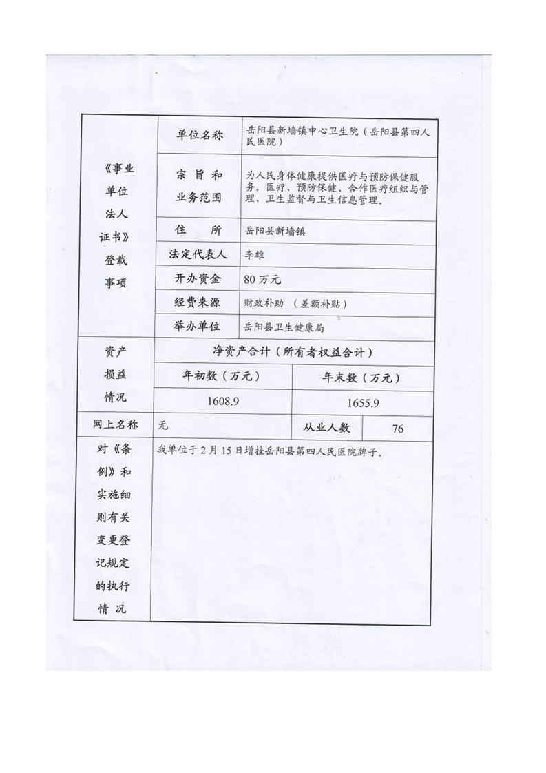 嶽陽縣衛生健康局新牆鎮衛生院年度報告書