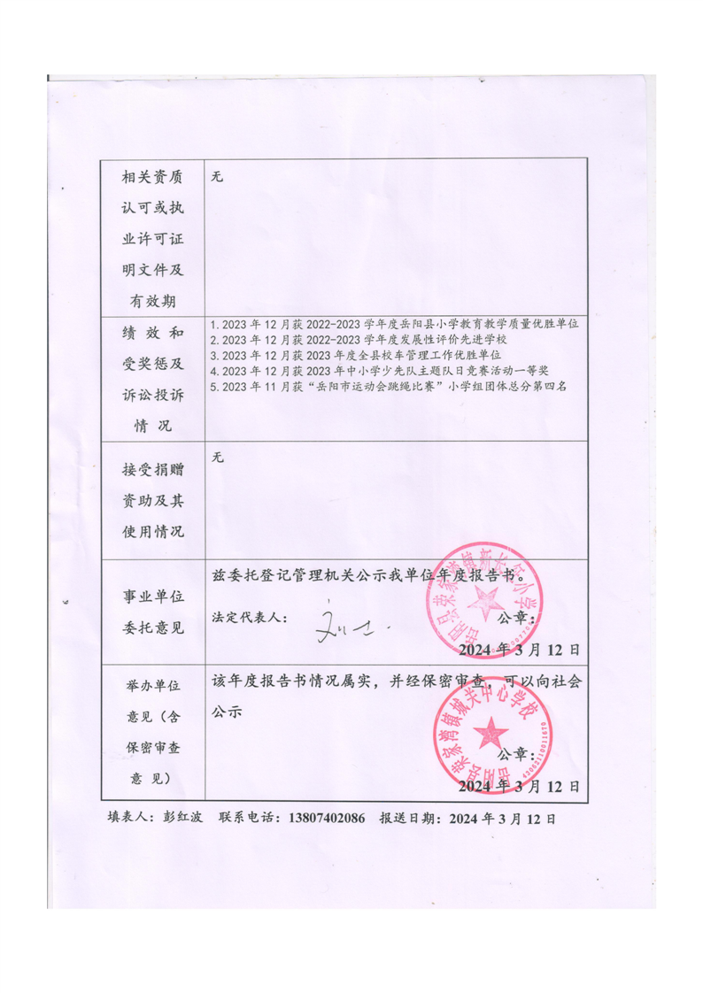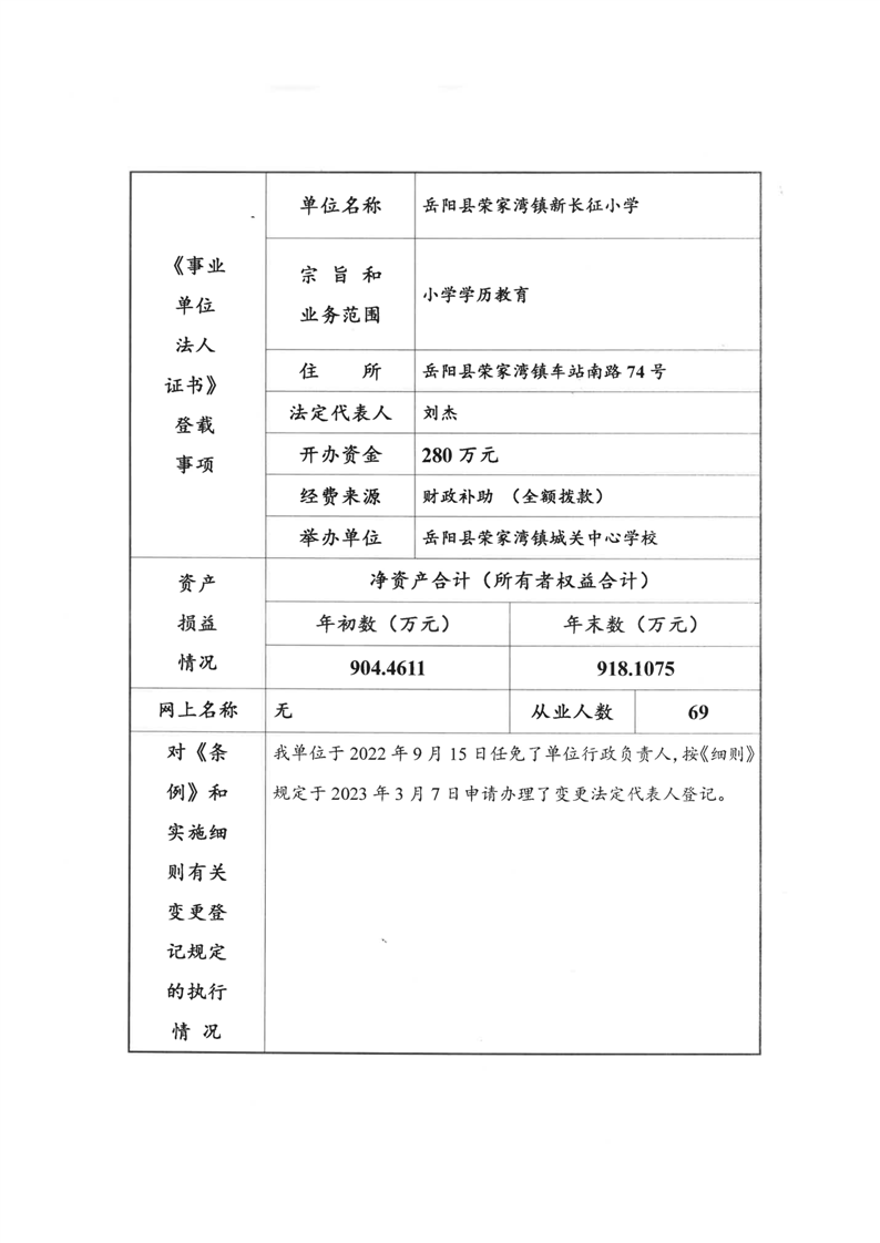 嶽陽縣榮家灣鎮新長征小學2023年法人年度報告書