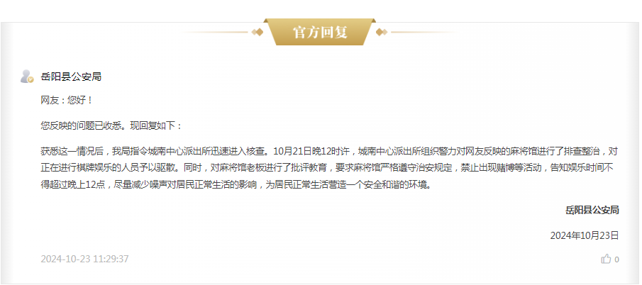嶽陽縣.城關鎮..東方西路與青山南路交叉口..佳士超市隔壁麻將館.淩晨2點太擾民了….希望有關部門能管管..讓附近居民有個好的休息環境……