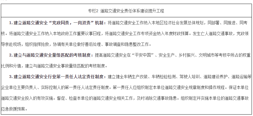 建立健全各級道路交通安全工作協調機製,堅持黨政同責、一崗雙責、齊抓共管、失職追責,落實黨政領導幹部道路交通安全責任製,推行道路交通死亡事故黨政領導到場製度。加大道路交通安全在“平安中國”、安全生產、鄉村振興、文明城市等考核中的權重,建立量級匹配的考核製度,真正形成責任全覆蓋、管理全方位、過程全監管的道路交通安全綜合治理格局。建立道路交通安全部門協作責任製,明確監管責任,細化責任清單,完善監管鏈條,真正形成監管合力。建立健全道路交通安全隱患排查治理體係,健全全鏈條、可追溯的管理機製。