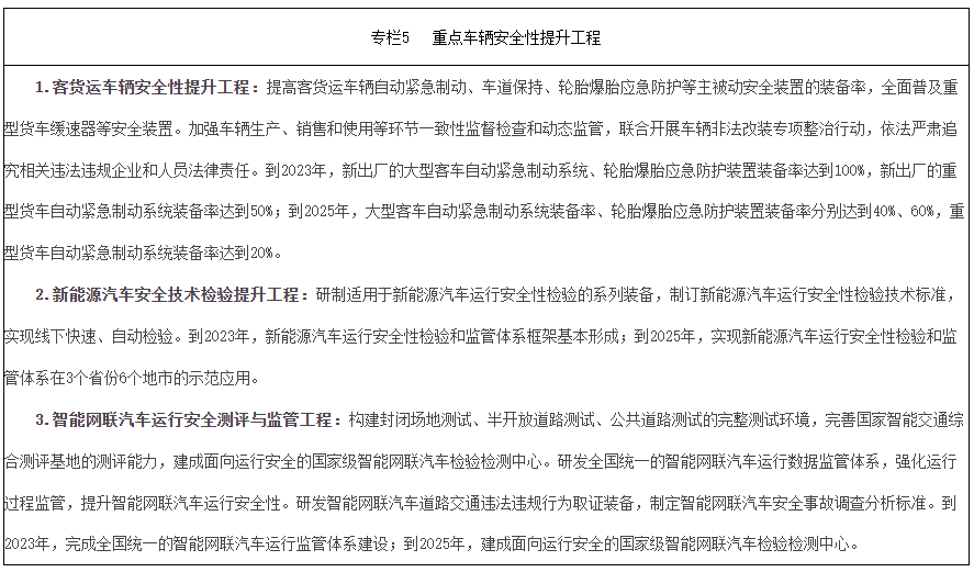 強化標準引領,修訂機動車運行安全國家標準,研究製定經營性機動車運營安全國家標準,推進客貨運車輛輔助安全、主被動安全標準升級。提升載客汽車安全要求,提升客運車輛阻燃性能水平,提高客運車輛安全逃生要求;提升車高大於或等於1850mm的小微型普通客車、麵包車安全性能,減少非法改裝和超載空間;實行公路客運、旅遊客運車輛全環節、全鏈條安全管理,鼓勵地方政府實施在用大中型客車安全性提升行動,依法推動不符合車輛安全技術條件要求、達到報廢標準的臥鋪客車、57座以上大客車等退出市場,推動客運車輛安裝乘員不係安全帶報警裝置。提升載貨汽車安全要求,推動重型貨車嚴格按照相關標準裝備車道偏離預警係統和車輛前向碰撞預警係統,嚴格自卸半掛車、平板式清障車等違規情形較多車型的安全技術規範,提升輕型貨車被動安全性能,製定實施載貨車輛貨物裝載與栓固國家標準,提高常壓液體危險貨物罐式車輛罐體防撞、防漏性能,推動低平板掛車退出散貨運輸市場,推動在用重型貨車安裝右側盲區消除預警裝置等安全裝置。提高客貨運車輛主被動安全裝置裝備率,推廣應用智能視頻監控報警技術,重型貨車全麵普及緩速器等安全裝置,加強中置軸掛車列車、雙掛汽車列車等新型汽車列車車型運行安全研究,探索駕駛行為動態監測裝置等輔助安全裝置應用,研究在“兩客一危”、貨車等重點車型安裝應用酒精鎖。提升新能源汽車安全要求,構建新能源汽車運行安全性檢驗技術及裝備體係,強化新能源汽車運行安全性檢驗和監管,嚴格規範遠程升級要求,保障車輛行駛安全性。