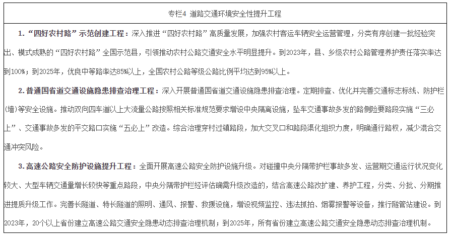 鞏固提升幹線公路重點路段安全隱患治理效果,推動瓶頸路段升級改造。持續推動雙向四車道以上的大流量公路,根據對向碰撞事故數量及公路功能、交通流量、設計速度等,按照相關標準規範要求逐步推進中央隔離設施設置。農村平交路口實施警告標誌、道路標線、減速帶、警示樁、交通信號燈(含閃光警告信號燈)“五必上”,具備條件的平交路口實施支路進主路“坡改平”工程。墜車交通事故多發的路側險要路段實施警告標誌、減速設施、路側護欄“三必上”。優化穿村過鎮路段交通組織和安全設施設置,引導不同性質交通流分道行駛,保障非機動車和行人通行空間。切實推動路側“小開口”、“綠植視距遮擋”等難點問題整改。針對事故多發路段、交通安全風險突出路段、新提級為國省道行政等級的道路,實施道路安全設施提檔升級。深入推動馬路市場等各類違規占用道路資源問題的清理整頓工作。推動在超限檢測站前設置貨車檢測車道和交通標誌,安裝電子抓拍係統,強化超限超載違法行為的發現能力,引導超限超載車輛進站接受檢測,消除超限超載違法行為。