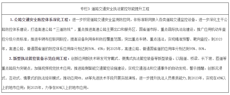 道路交通治理能力達到新水平。法治思維、係統觀念不斷融入道路交通安全治理,大數據、人工智能、5G等新技術充分應用於道路交通安全管理工作,交通秩序明顯改善,風險防控、執法管控與應急救援等能力明顯提升。