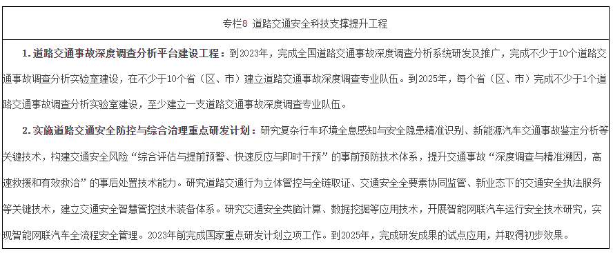 推動設立道路交通安全防控與綜合治理重點研發計劃,推進圖像智能識別、北鬥高精定位、5G+AI、邊緣計算等新技術在交通安全治理中的應用,針對新業態新問題開展前瞻性研究探索。研究智能網聯汽車運行管理、通行規則、事故責任認定等政策法規與安全保障技術,加快研究製定相關標準規劃,製定自動駕駛運行安全測試技術體係,強化測試過程監管,促進自動駕駛新業態安全、健康發展。研究車路協同應用技術架構體係,開展路側設施數字化智能化改造、車路協同示範應用。研究全麵城鎮化、快速機動化、人口老齡化等社會經濟條件變化在道路交通領域衍生的係列安全問題,探索針對性解決方案。
