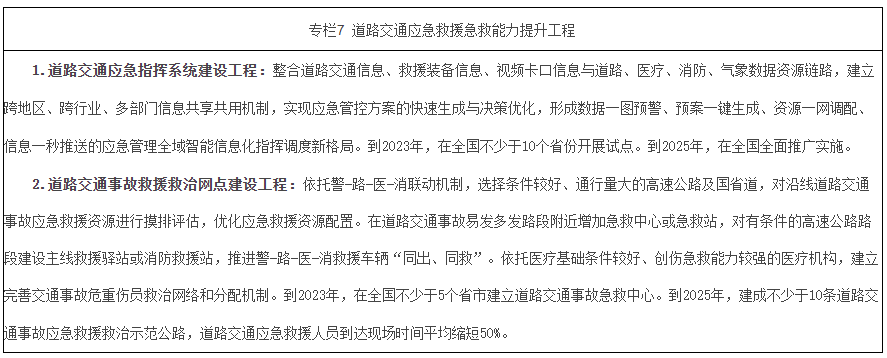 健全完善道路交通應急管理和救援標準體係,建立道路交通應急資源庫,打通各部門風險監測、感知、識別、預警信息鏈路,實現跨部門信息數據實時共享傳遞和交通應急管理一張圖。健全道路交通突發警情信息報送處置體係,加強事故、災害等突發警情信息監測分析,提升危險貨物運輸車輛事故處置救援專業化水平。開展危險化學品安全信息碼與電子運單融合試點,製定完善危險貨物道路運輸事故應急救援裝備標準,研發專用防護救援裝備,完善不同品類的危險貨物道路運輸事故預案措施。提升公路車輛救援規範化水平。加強突發事件下應急物資道路運輸保障體係建設。完善更新各類應急預案並加強演練,加強應急裝備物資儲備。依托實戰訓練基地加強對道路交通應急指揮、物資調配、疏導管製、事故處置、輿情引導等預案實景或虛擬場景的演練訓練,提升應急條件下的風險識別與處置、防護等技能。