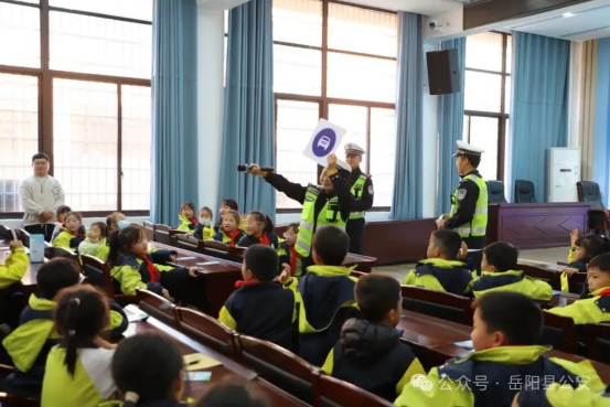 下午,宣傳活動走進嶽陽縣城南小學。活動中,交警現場演示了直行、轉彎、停止、減速慢行等交通指揮手勢操,一邊規範演示一邊細致講解,逐一說明每種手勢的核心含義、動作要領及適用場景,幫助師生直觀清晰地理解交通指揮信號,提升日常出行中對交通信號的辨識能力。