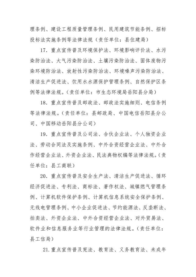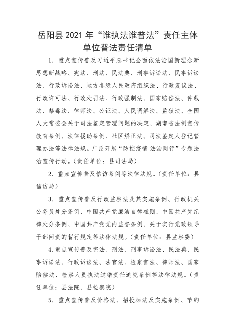 關於印發《嶽陽縣2021年“誰執法誰普法”責任主體單位普法責任清單》的通知