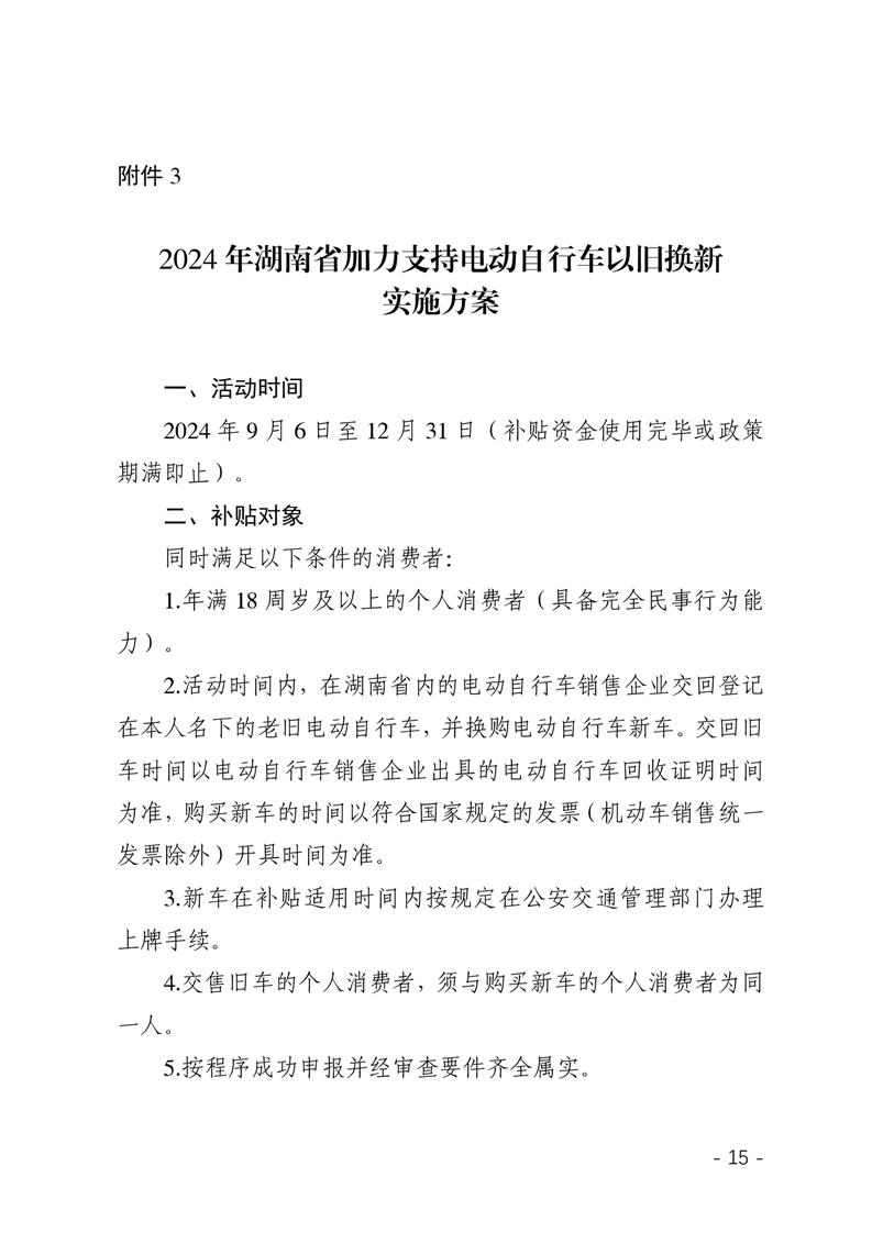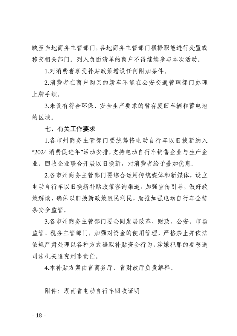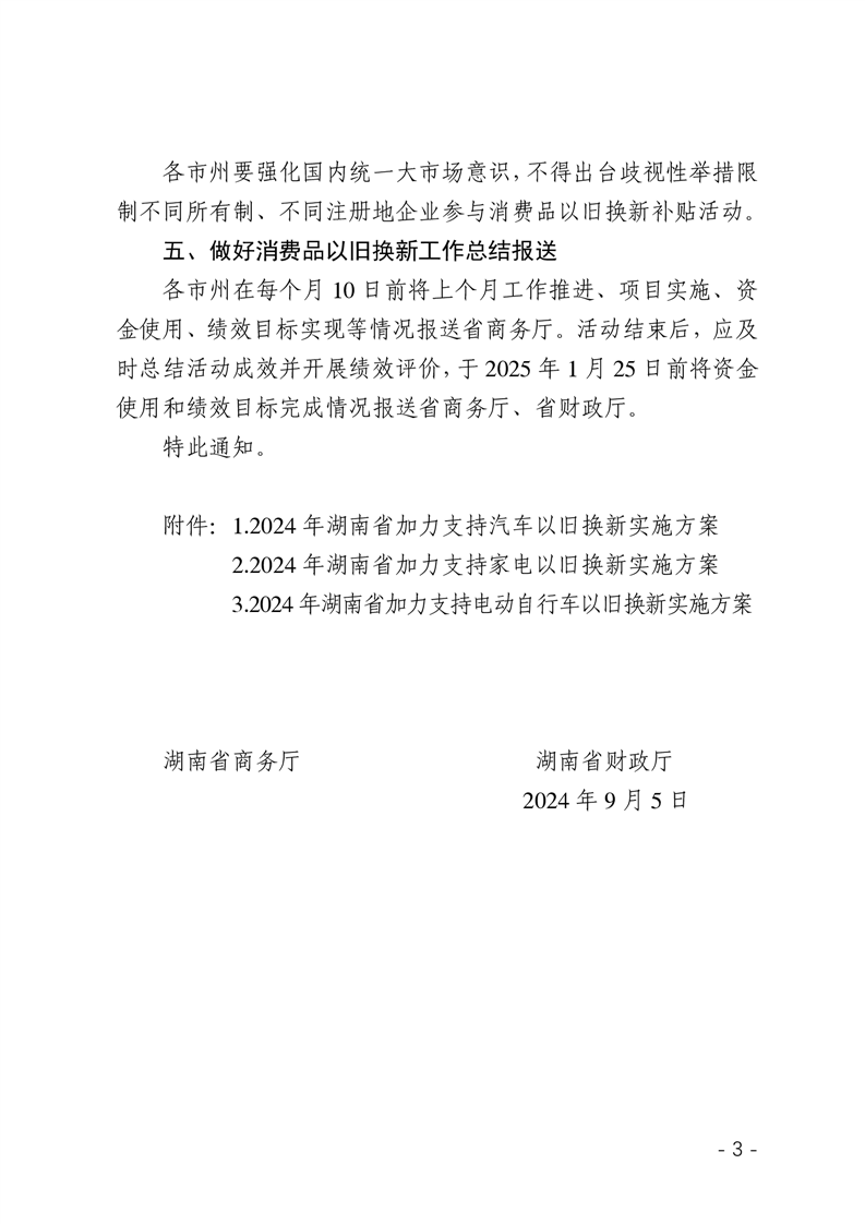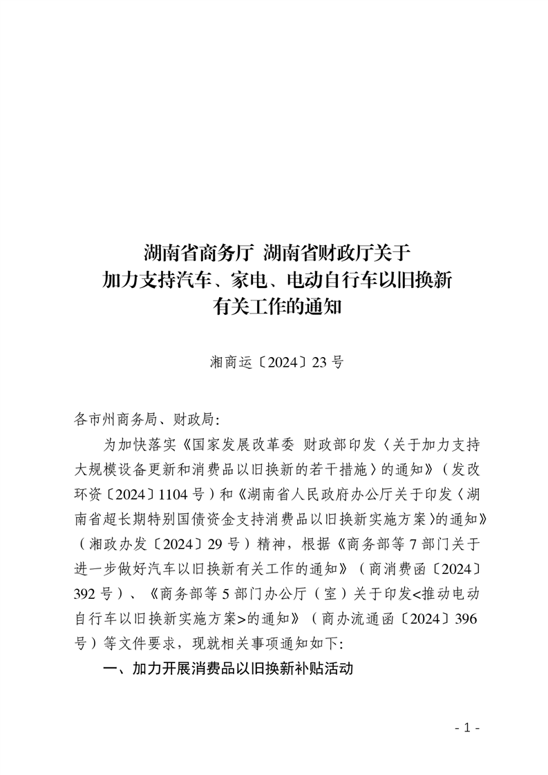 湖南省商務廳 湖南省財政廳關於 加力支持汽車、家電、電動自行車以舊換新 有關工作的通知