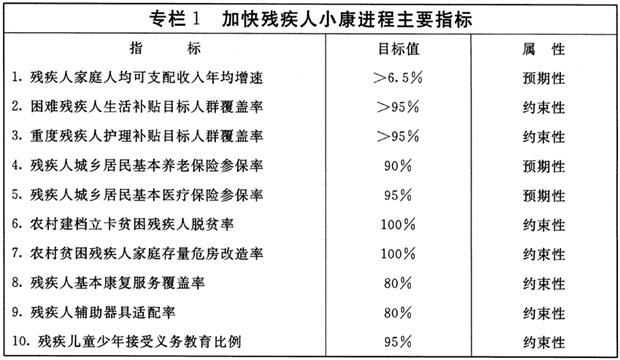 (三)主要目標。到2020年,殘疾人權益保障製度基本健全,基本公共服務體係更加完善,殘疾人事業與經濟社會協調發展;殘疾人社會保障和基本公共服務水平明顯提高,殘疾人融合發展得到大力推進,廣大殘疾人生活更加殷實、更加幸福、更有尊嚴。