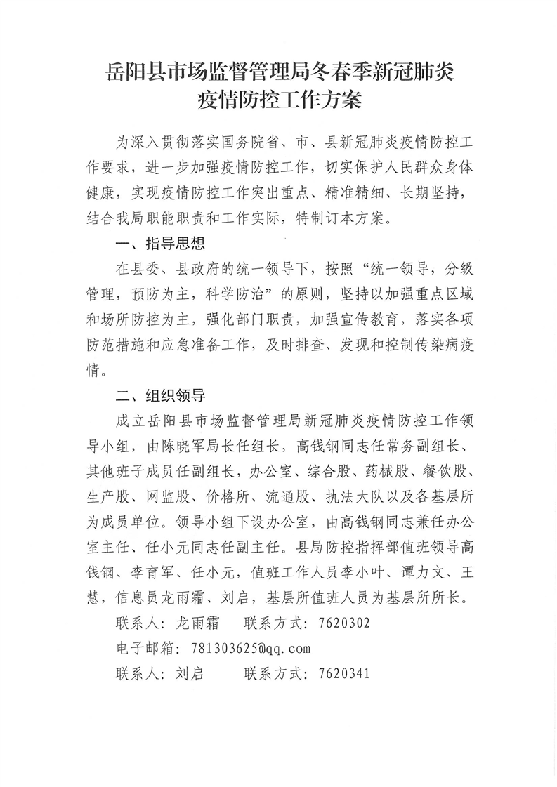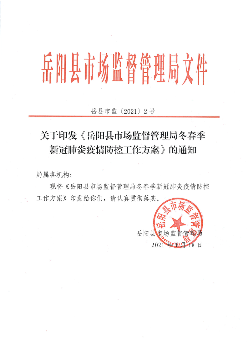 嶽陽縣市場監督管理局冬春季新冠肺炎疫情防控工作方案