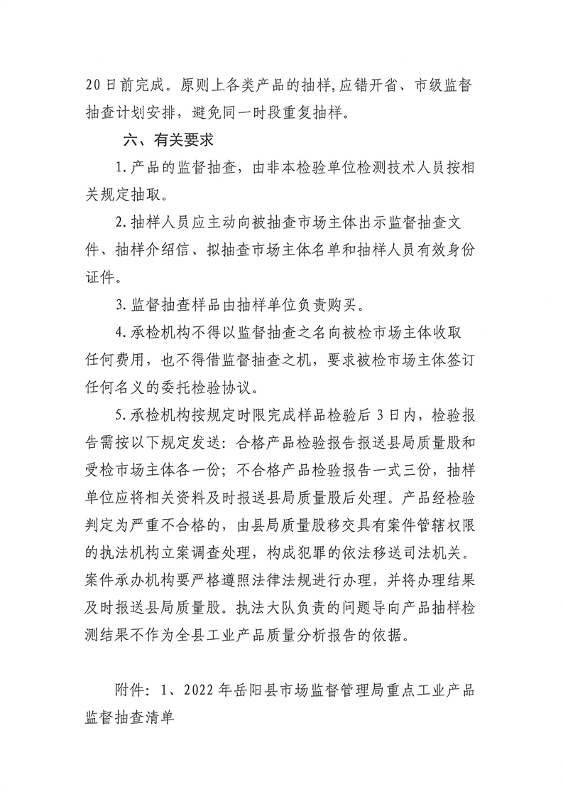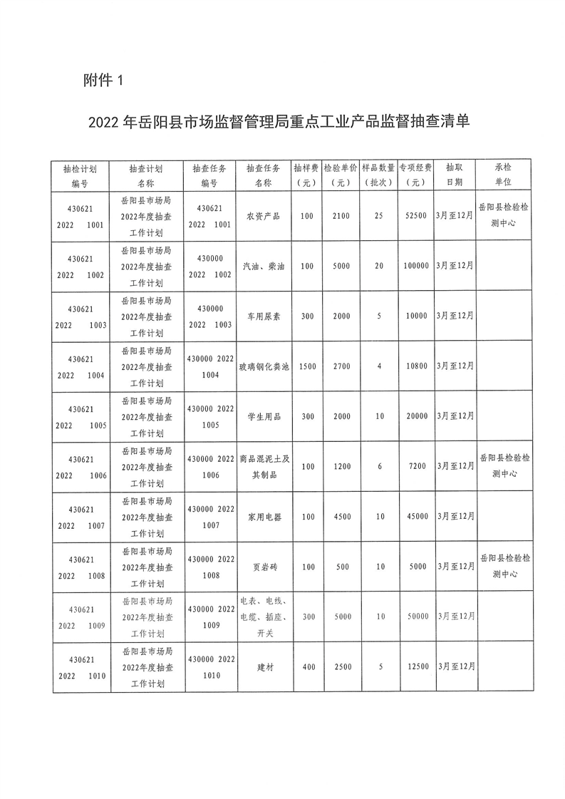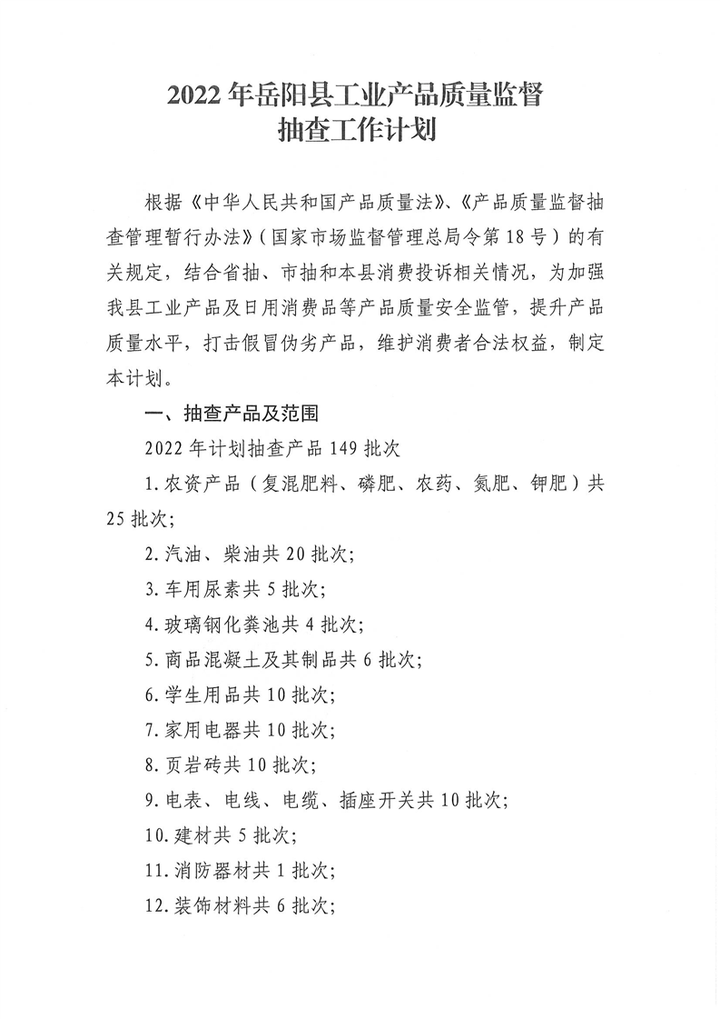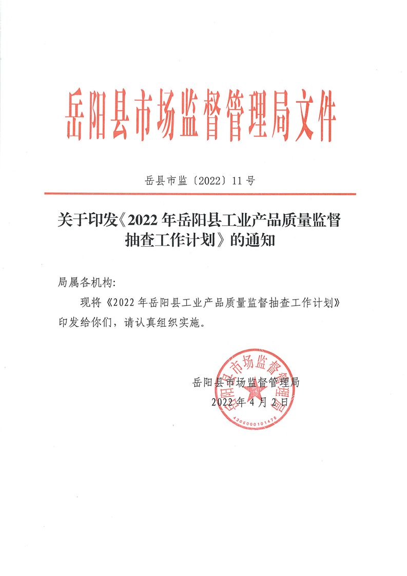 嶽縣市監〔2022〕11號關於印發《2022年嶽陽縣工業產品質量監督抽查工作計劃》的通知