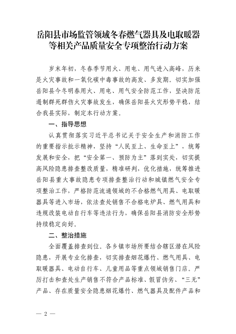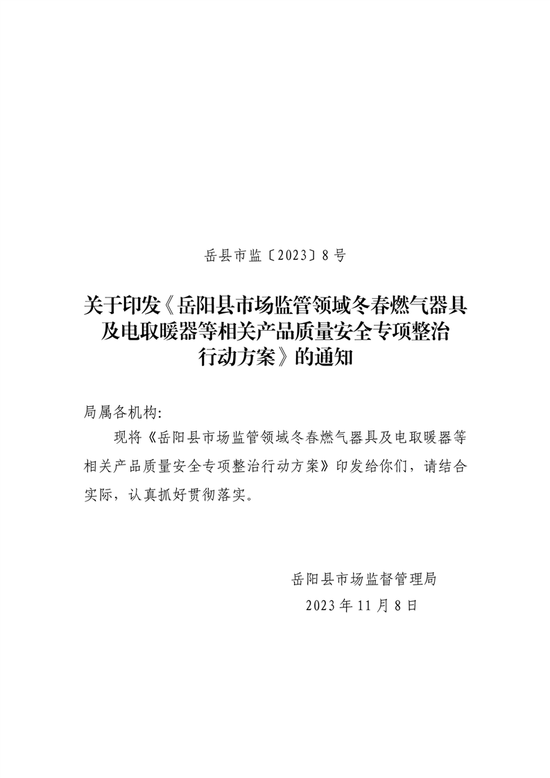 嶽縣市監〔2023〕8號關於印發《嶽陽縣市場監管領域冬春燃氣器具及電取暖器等相關產品質量安全專項整治行動方案》的通知