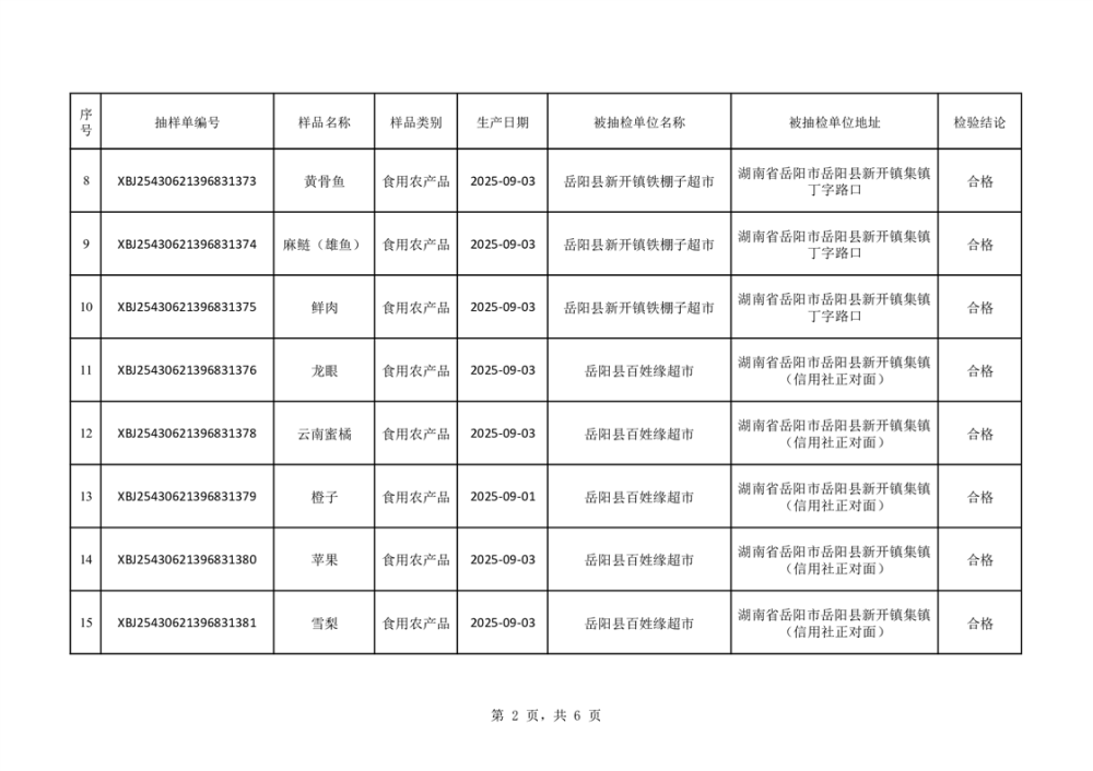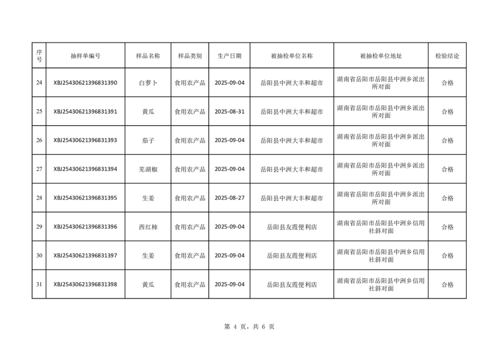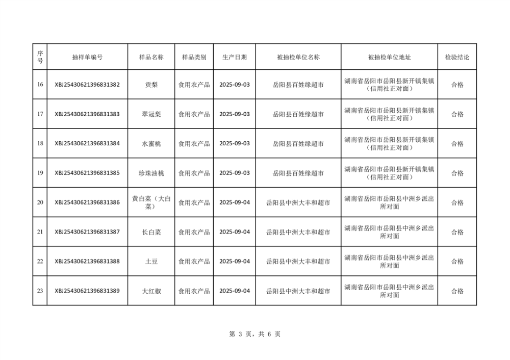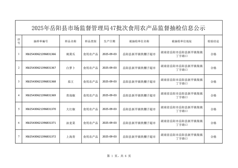 2025年10月16日抽檢數據公示(合格47批-華中)