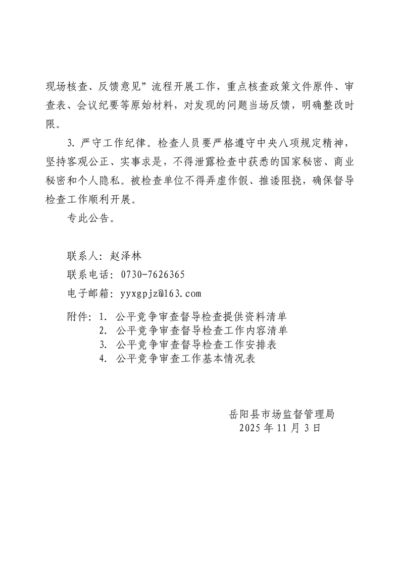 關於開展2025年嶽陽縣公平競爭審查督導檢查的公告