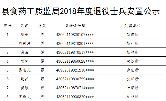 縣食藥工質監局2018年度退役士兵安置公示