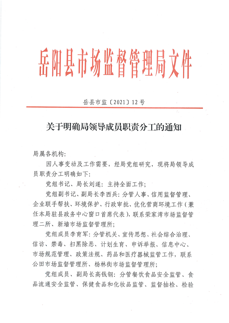 嶽縣市監〔2021〕12號關於明確局領導成員職責分工的通知