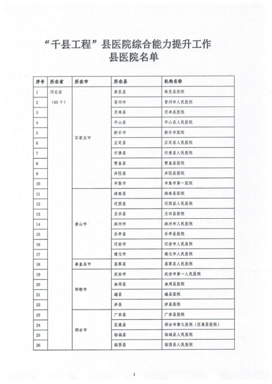 根據《國家衛生健康委辦公廳關於印發“千縣工程”縣醫院綜合能力提升工作方案(2021-2025年)的通知》,結合“十三五”時期全國縣醫院醫療服務能力評估和各地推薦情況,我委研究確定了首批納入“千縣工程”縣醫院綜合能力提升工作的縣醫院名單。現將名單印發給你們,請認真組織落實有關工作要求。我委將對納入“千縣工程”的縣醫院進行動態管理,結合全國縣醫院醫療服務能力年度評估情況和各地工作進展情況,適時調整縣醫院名單。