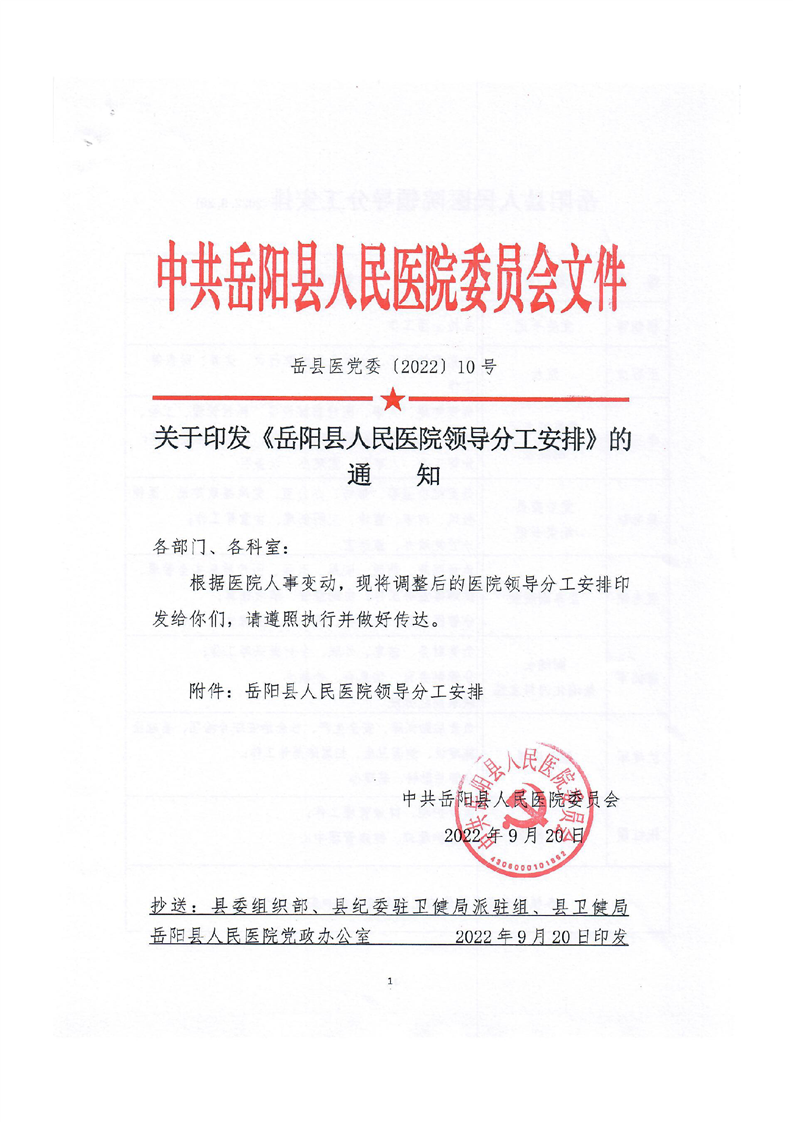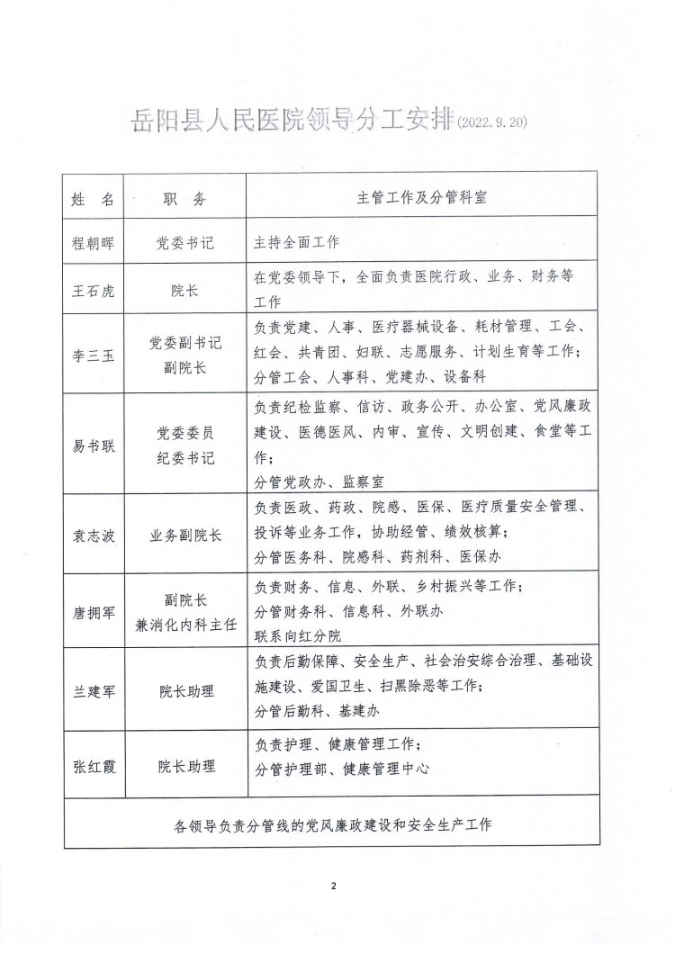 嶽陽縣人民醫院領導分工安排(2022.9.20)