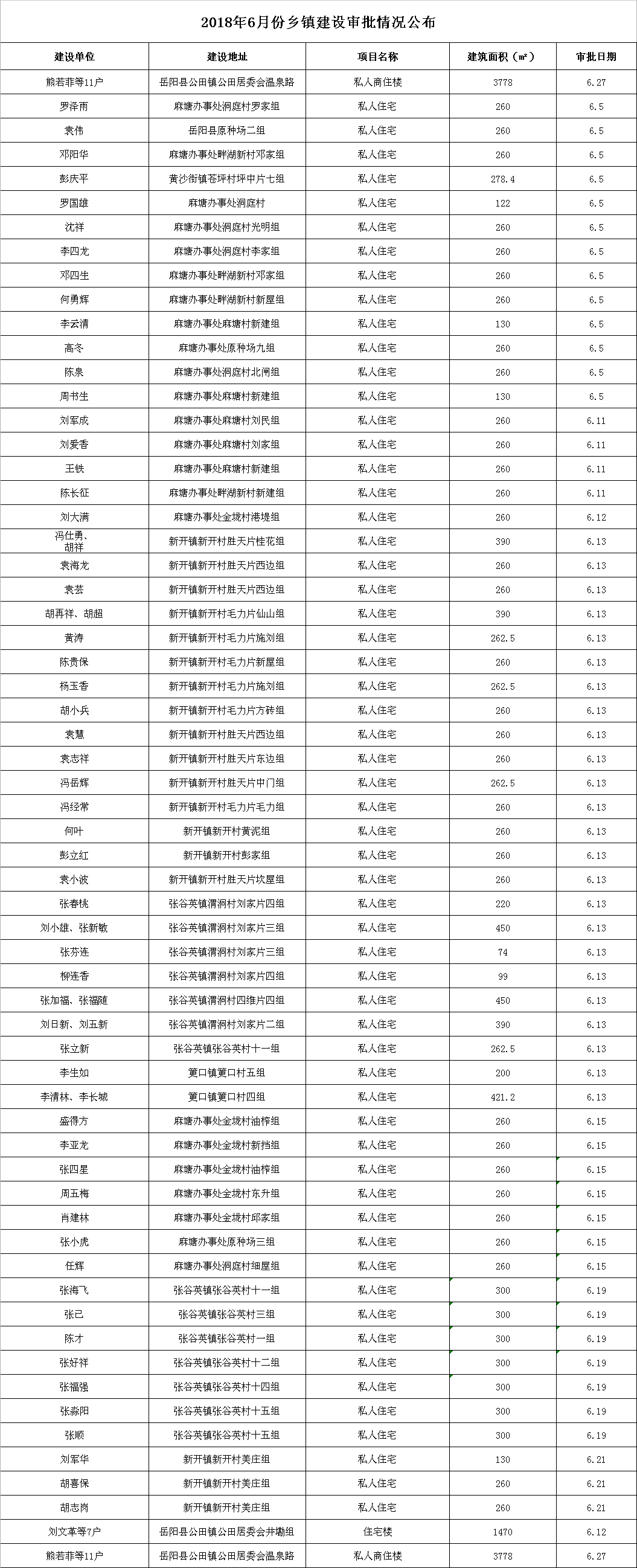 2018年6月份鄉鎮建設審批情況公布