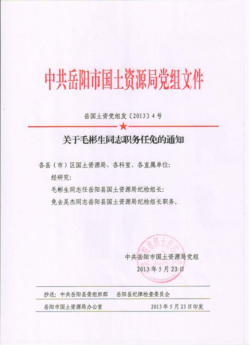 關於毛彬生同誌職務任免的通知