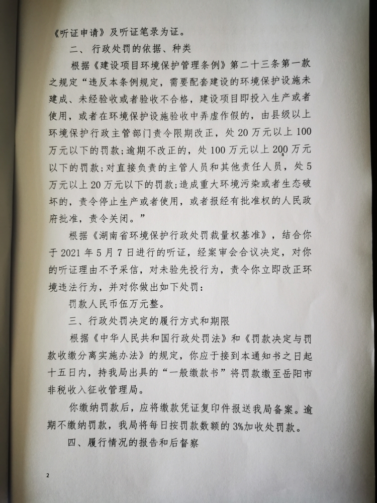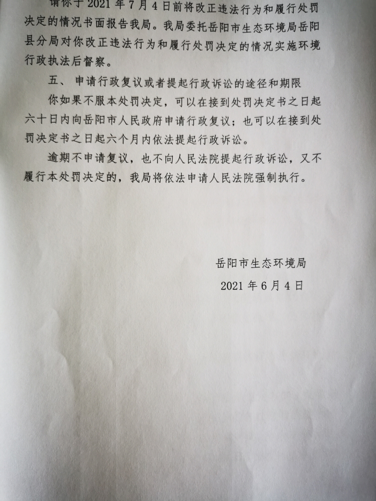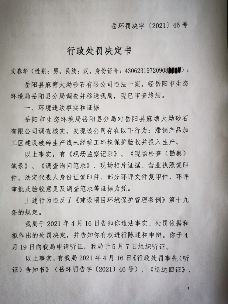 行政處罰決定書 嶽環罰決字[2021]46號