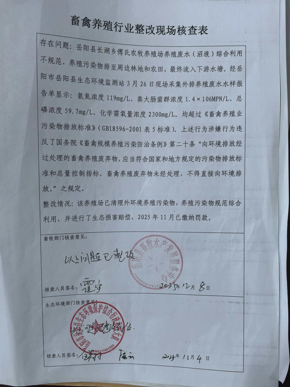 嶽陽縣長湖鄉傅氏農牧養殖場【嶽縣環罰(2025)2號】整改措施落實情況後督查